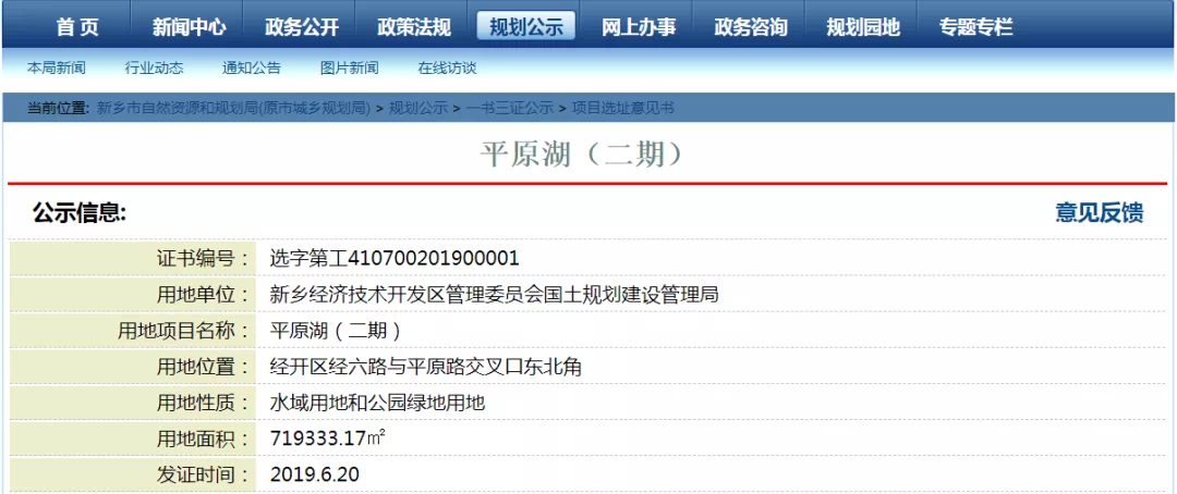 根据新乡市自然资源和规划局公示显示,平原湖(二期)位于经开区经六路与平原路交叉口东北角,占地面积719333.17㎡,(约180.31亩),用地性质为水域用地和公园绿地用地,建设单位为新乡经济技术开发区管理委员会国土规划建设管理局。