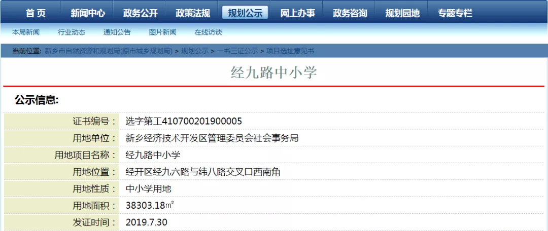 新乡市自然资源和规划局公示显示,经九路中小学位于经开区经九六路与纬八路交叉口西南角,用地性质为中小学用地,占地面积38303.18㎡,(约57.5亩),建设单位为新乡经济技术开发区管理委员会社会事务局。