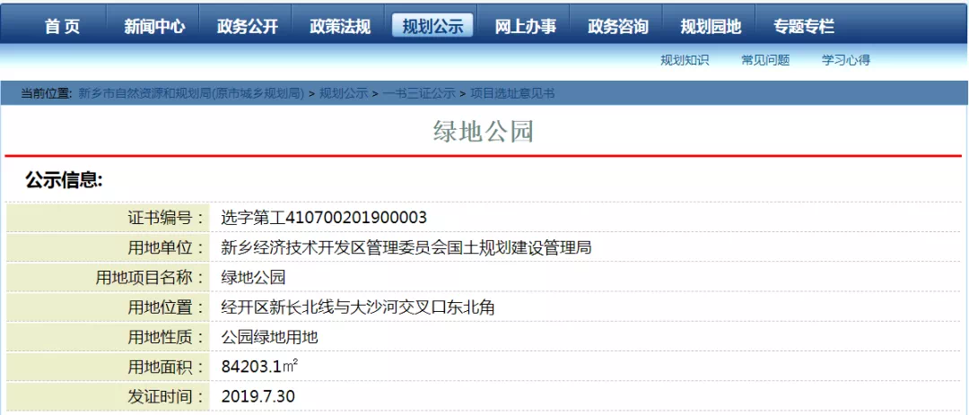 从新乡市自然资源和规划局的公示中,我们看到:绿地公园项目位于经开区新长北线与大沙河交叉口东北角,占地面积为84203.1㎡(约126.3亩),用地性质为公园绿地性质,建设单位为新乡经济技术开发区管理委员会国土规划建设管理局。