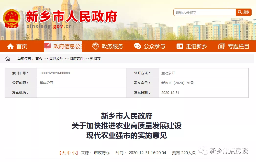 农业是人类衣食之源、生存之本,是一切生产的首要条件。近几年,农业在城市发展中的位置逐渐凸显,多个城市开启“农业强市”道路,促进经济建设发展!2020年12月31日,新乡市政府发布《关于加快推进农业高质量发展建设现代农业强市的实施意见》,加快推进我市农业高质量发展,建设现代农业强市。