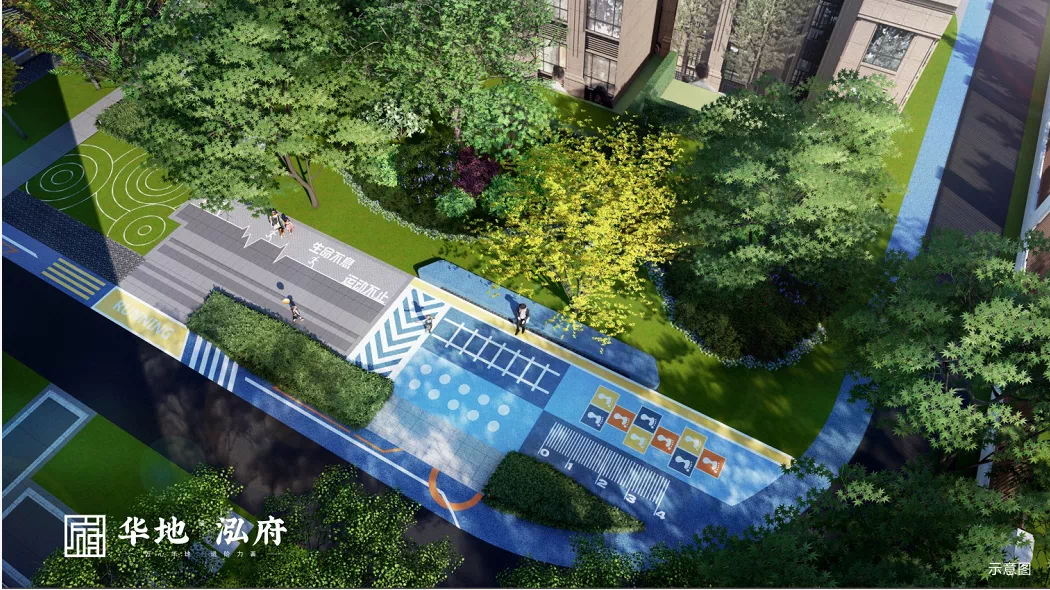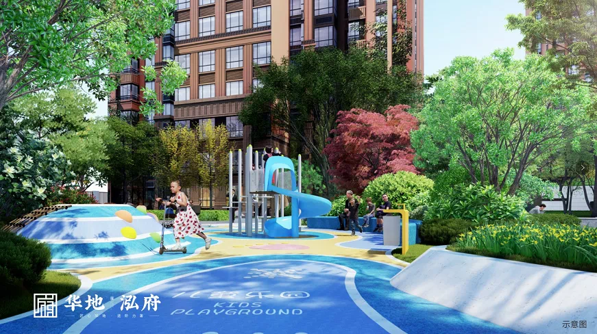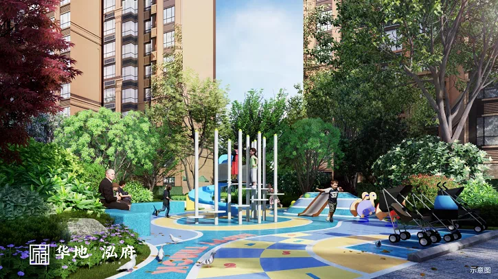 效果图自然互动式儿童游憩区升级。华地泓府从对儿童的认知、语言、运动和心理特点的基础上,分区域、分年龄段,打造一个安全有自然野趣的空间来供儿童游憩,给孩子一个美好的童年时光。