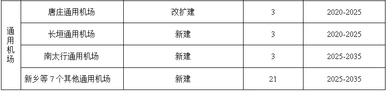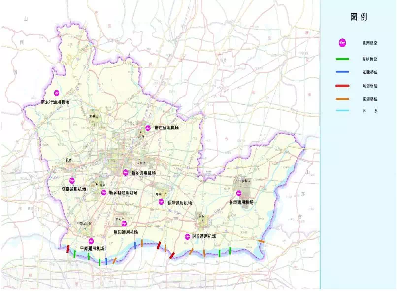 完善通用机场布局体系,引导农林大县(市)、旅游景区等规划建设通用机场,加快已批通航机场建设工作。规划新乡市城南、新乡县、原阳县、获嘉县、封丘县、延津县、辉县市(太行山)等通用机场,实现“县县通”。有序拓展通用航空应急救援、航空旅游、公(商)务飞行及无人机应用等新兴业务。近期建成长垣、唐庄通用机场,基本实现30分钟航程覆盖全市域,远期建成完备的通用航空服务体系,实现15分钟航程覆盖全市域。