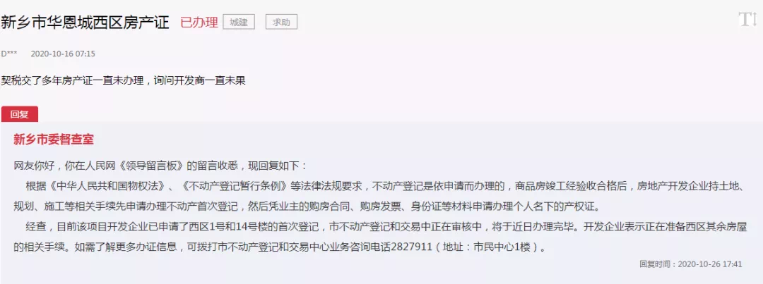 官方表示:经查,目前该项目开发企业已申请了西区1号和14号楼的首次登记,市不动产登记和交易中正在审核中,将于近日办理完毕。开发企业表示正在准备西区其余房屋的相关手续。