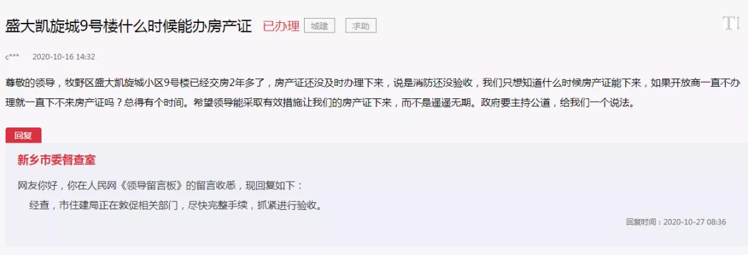 官方表示:经查,市住建局正在敦促相关部门,尽快完整手续,抓紧进行验收。
