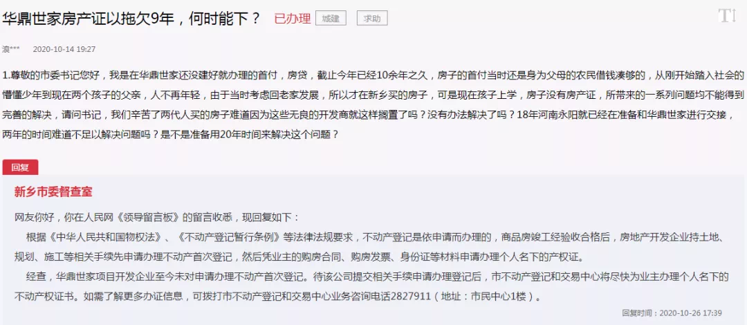 官方表示:经查,华鼎世家项目开发企业至今未对申请办理不动产首次登记。待该公司提交相关手续申请办理登记后,市不动产登记和交易中心将尽快为业主办理个人名下的不动产权证书。