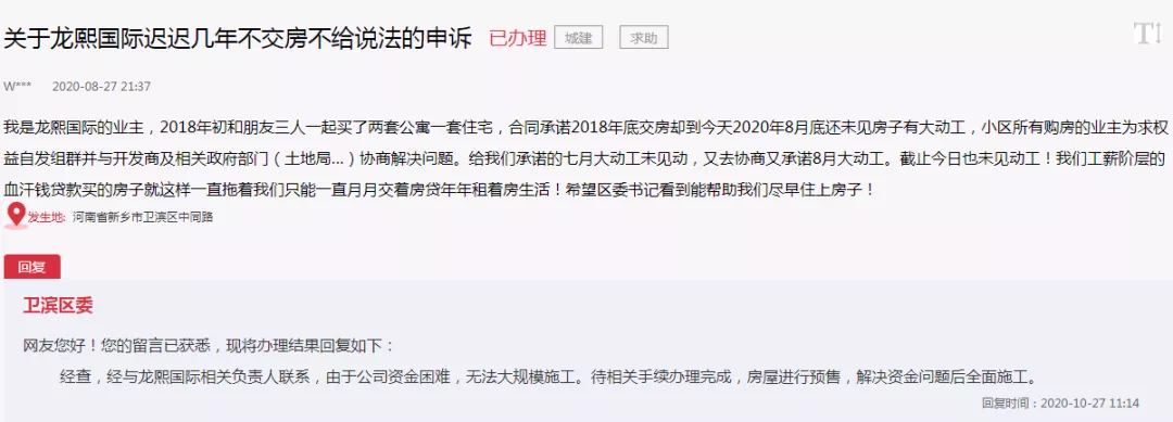官方表示:经查,经与龙熙国际相关负责人联系,由于公司资金困难,无法大规模施工。待相关手续办理完成,房屋进行预售,解决资金问题后全面施工。