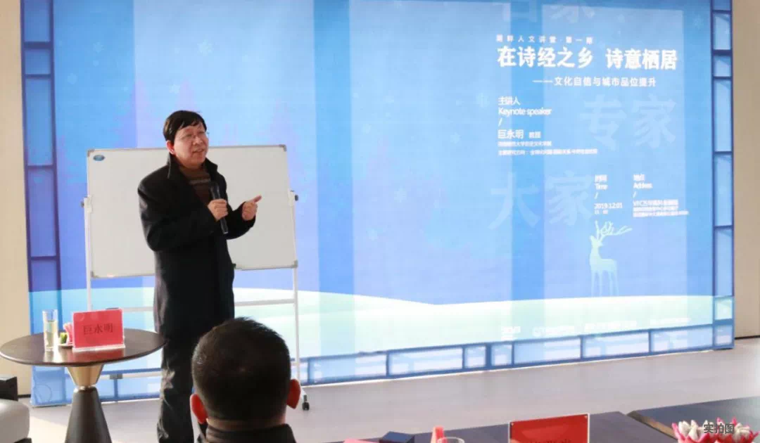 随后,巨永明教授开启近一个小时的主题演讲,巨教授以其渊博的学识,生动的讲授方式,从多角度解析城市文化,呼吁增强文化自信,提升城市文化品位,将文化的张力变成城市的活力。为现场嘉宾描绘出一幅纵贯古今的城市文化长卷,让每位嘉宾沉浸其中,感受知识文化的洗礼。