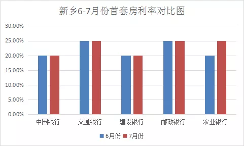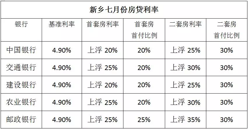 随机查询了新乡五个银行7月的房贷利率,在新乡这五个银行中,首套房利率上浮20%的有两家银行,其余三家银行首套房房贷利率在上浮25%左右,二套房房贷利率分别在上浮25%、30%、35%。