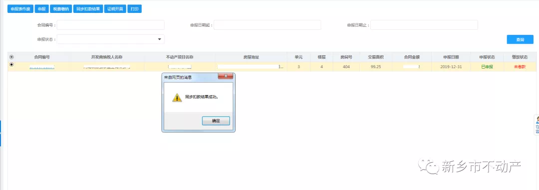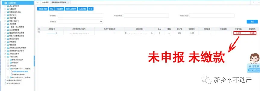 3. 点击“确定”后页面跳转至【增量房交易申报】历史查询页面,根据合同编号选中对应的已保存“未申报”记录,点击“申报”,该条记录状态变为“已申报,未缴款”,如图: