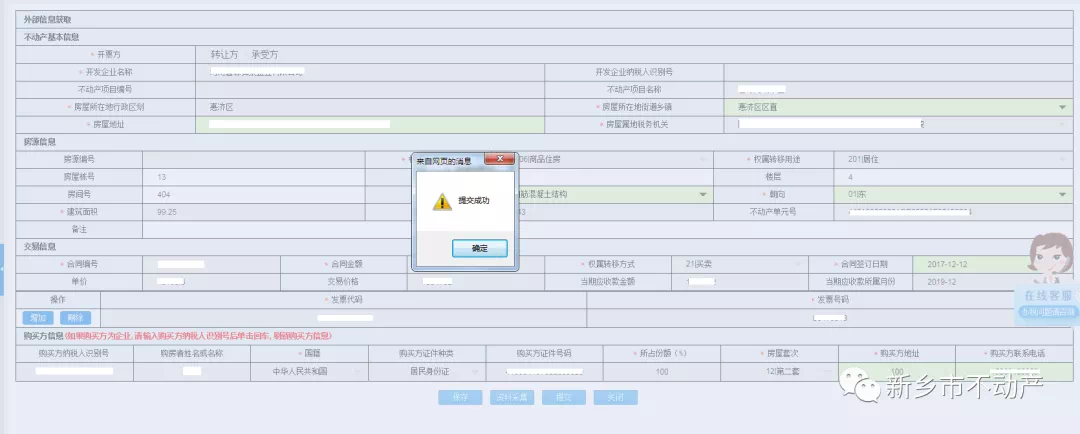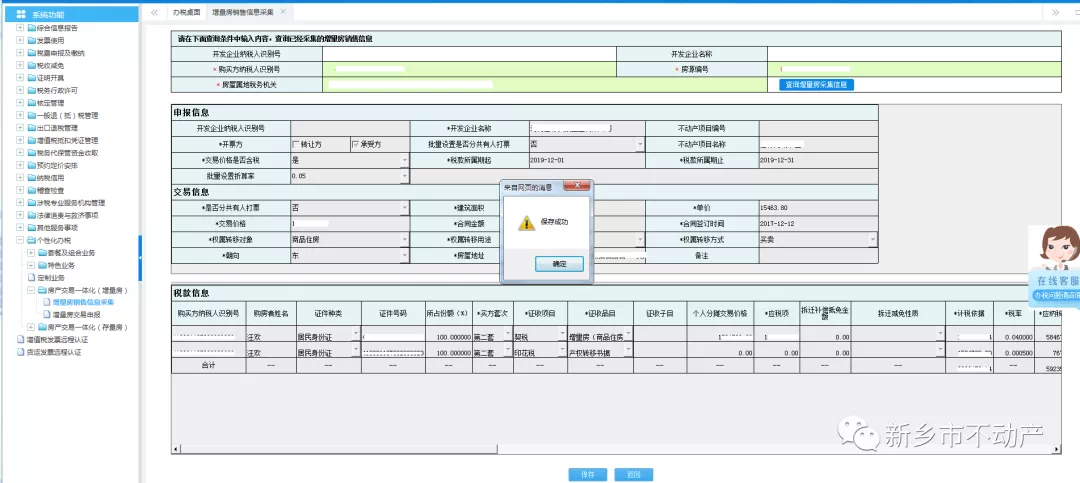 3.点击【保存】按钮,待页面弹出提示框提示“增量房销售信息采集成功”,点击【确定】按钮,表单填写的内容被保存,如图: