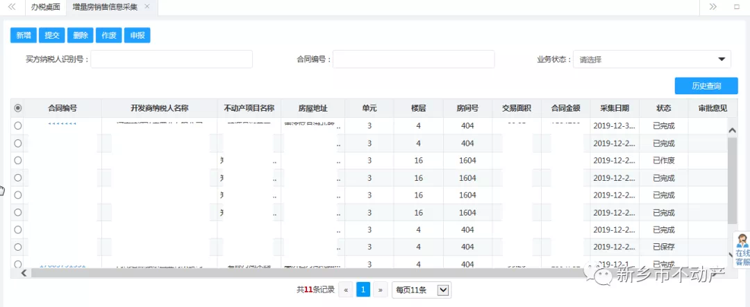 注:“已完成”状态下且已申报记录,对已采集的增量房信息无法进行修改、删除操作,如用户需要变更信息只能先行作废申报记录,再按照“作废”-“删除”-“新增”步骤重新采集信息;