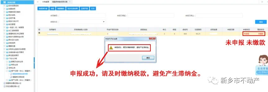 4.勾选“已申报,未缴款”的增量房信息点击【税费缴纳】进行扣款操作,如图: