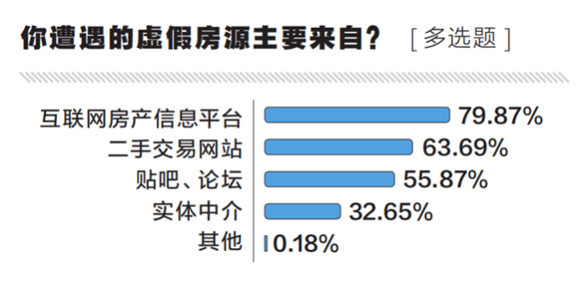 报告显示,近八成虚假房源来自网络,互联网房产信息平台、贴吧/论坛、二手交易网站正是虚假房源信息的重灾区,受访者在这三个渠道遭遇虚假房源的比例均超过了5成。其中,79.87%的受访者在互联网房产信息平台上碰到过虚假房源;二手交易网站和贴吧/论坛的比例则分别为63.69%、55.87%,实体中介的虚假房源信息位列第四,为32.65%。