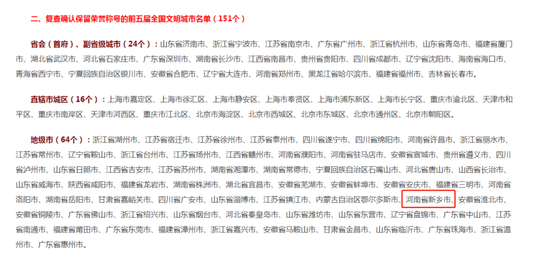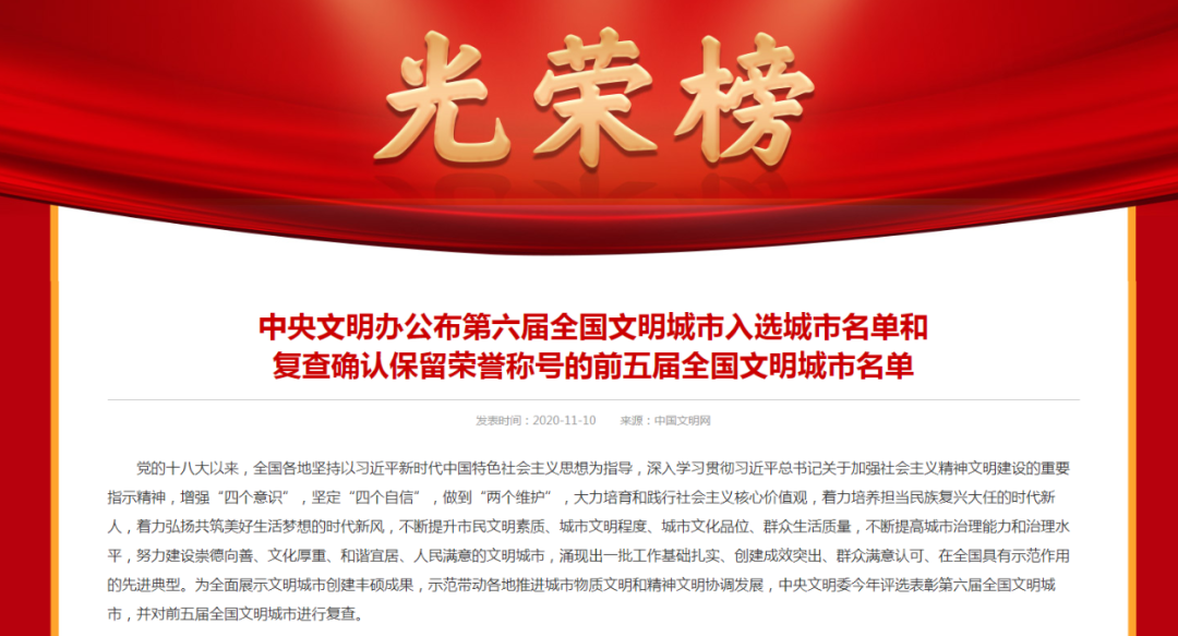 2020年11月10日,中央文明办公布第六届全国文明城市入选城市名单和复查确认保留荣誉称号的前五届全国文明城市名单,新乡市再次获得“全国文明城市”荣誉称号。