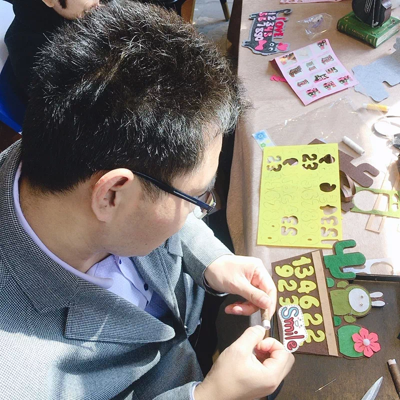 剪裁好不织布,挑选自己喜欢的样式,亲手搭配喜欢的颜色,小朋友们兴致盎然,整个售楼部沉浸在一片欢乐与温馨的气氛中。
