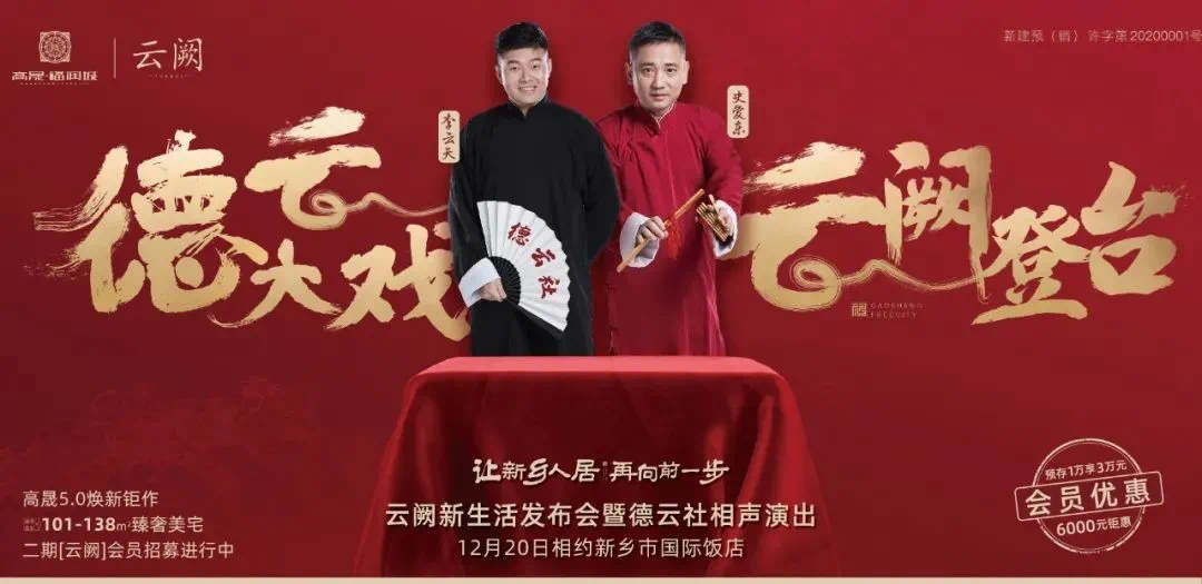 12月20日,云阙新生活发布会暨德云社相声演出,于新乡市国际饭店,与您相约,不见不散,高晟·福润城5.0产品,二期云阙,焕新钜作,幸福会员招募中“日进斗金”6000元优惠1万享3万元限时盛惠,约惠全城