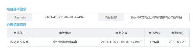近日,看河南省投资项目在线审批监管平台网上申报系统发现,新乡发改委通过了7个棚改项目的备案。包含金属材料公司棚户区改造项目、新航集团家属区棚户区改造项目、荣康医院北家属院以东区域改造项目、哑巴胡同及周边区域棚户区项目、荣校路街道办事处畅岗城中村改造、胜利影院及周边区域改造项目、牧野区丝绸胡同棚户区改造项目。