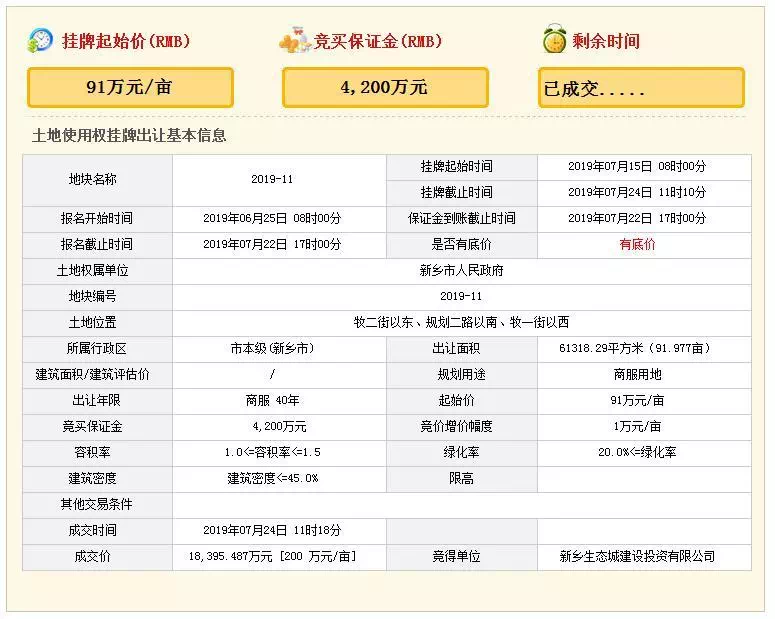 2019—11号宗地地块位于107国道以南、规划东环路以西、府前街以东、规划贺堤南路以北,占地面积在104.59亩,土地性质为住宅兼容商用,容积率在1.0-2.0,起拍价24055.61万元,起拍楼面价为1725元/㎡。