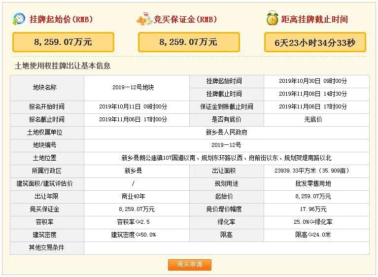 2019-12地块位于新乡县朗公庙镇107国道以南、规划东环路以西、府前街以东、规划贺堤路以北,该地块占地35.909亩,容积率为2.5,起拍价为8259.07万元。